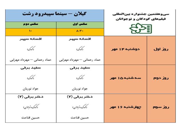 ناجه خبر به نقل از روابط عمومی اداره کل فرهنگ و ارشاد اسلامی گیلان ، همزمان با برگزاری سی و هفتمین جشنواره بین المللی فیلمهای کودکان و نوجوانان در اصفهان ، تعدادی از آثار منتخب این جشنواره نیز در سینما سپیدرود رشت به نمایش در خواهد آمد .